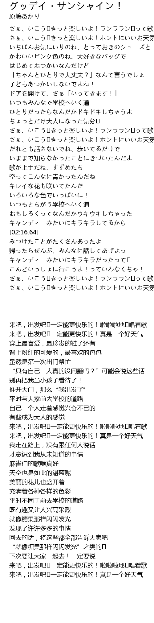 | [01:19.37] | 来吧,出发吧♪一定能更快乐的!真是一个好天气! |