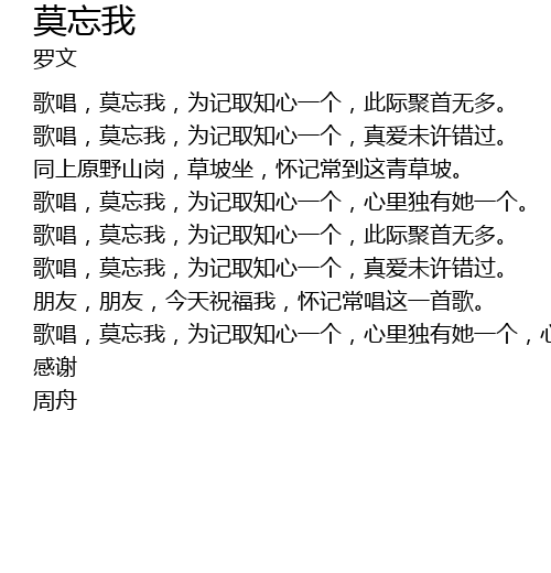 | 歌唱,莫忘我,为记取知心一个,心里独有她一个,心里独有她一个,心里独有她一个。 | |