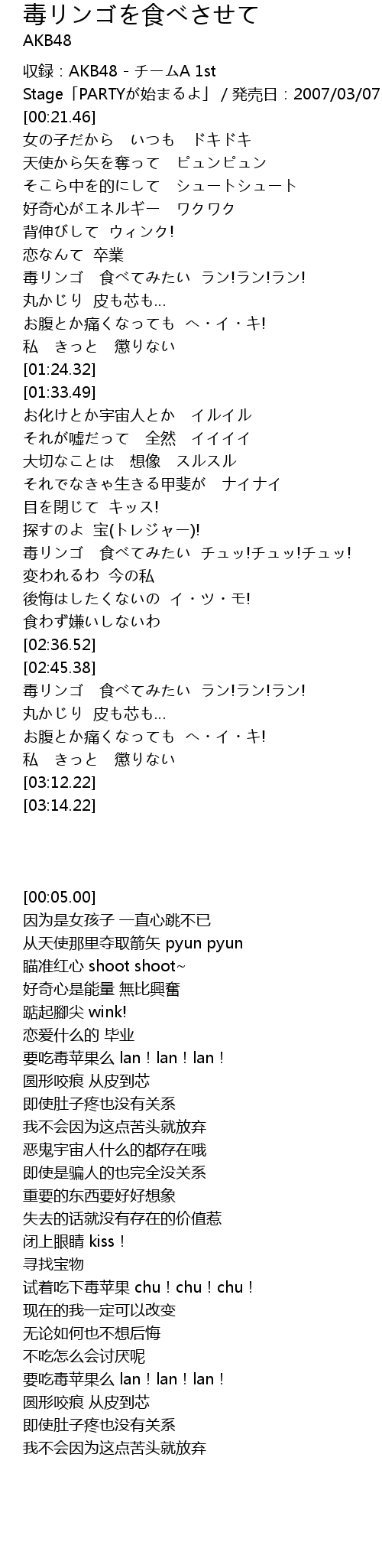 | [00:05.00] | 収録:AKB48 - チームA 1st Stage「PARTYが始まるよ」/発売日:2007/03/07 |