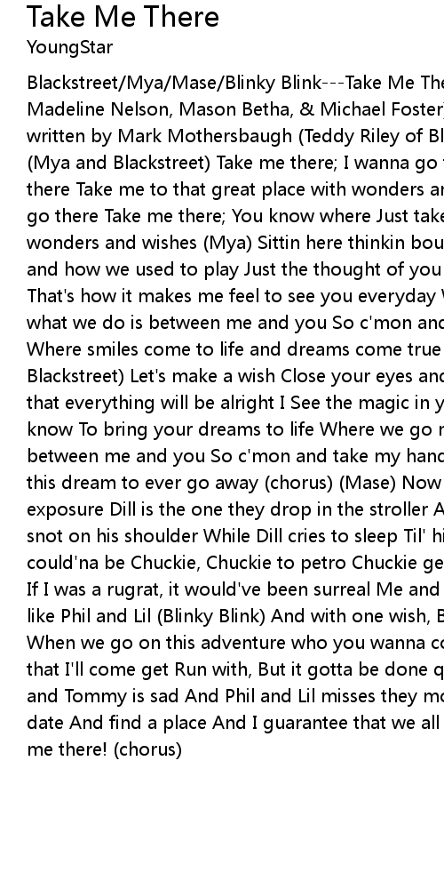 Blackstreet/Mya/Mase/Blinky Blink---Take Me There (Teddy Riley, Tamara Savage, Madeline Nelson, Mason Betha, & Michael Foster) Excerpts of "The Rugrats Theme" written by Mark Mothersbaugh (Teddy Riley of Blackstreet) R-U-G-R-A-T-S (chorus) (Mya and Blackstreet) Take me there; I wanna go there Take me there; Let's go there Take me to that great place with wonders and wishes Take me there; I wanna go there Take me there; You know where Just take me to that great place with wonders and wishes (Mya) Sittin here thinkin bout yesterday About what we did and how we used to play Just the thought of you brings a smile upon my face That's how it makes me feel to see you everyday Where we go nobody knows And what we do is between me and you So c'mon and take my hand to that special place Where smiles come to life and dreams come true (chorus) (Chauncey of Blackstreet) Let's make a wish Close your eyes and count to five Cuz you know that everything will be alright I See the magic in your eyes Cuz the love you know To bring your dreams to life Where we go nobody knows And what we do is between me and you So c'mon and take my hand to that special place Don't want this dream to ever go away (chorus) (Mase) Now Angelica the one wit' all the exposure Dill is the one they drop in the stroller And Tommy is the one with snot on his shoulder While Dill cries to sleep Til' his eyes get bleak And I could'na be Chuckie, Chuckie to petro Chuckie get scared, Chuckie so "Let's Go" If I was a rugrat, it would've been surreal Me and my twin would've been just like Phil and Lil (Blinky Blink) And with one wish, Blink grant you one trip When we go on this adventure who you wanna come with See you my little brother that I'll come get Run with, But it gotta be done quick Yo, Chuckie is scared and Tommy is sad And Phil and Lil misses they mommy and dad So pick a time and date And find a place And I guarantee that we all get home safe (Mya) Just take me there! (chorus) |