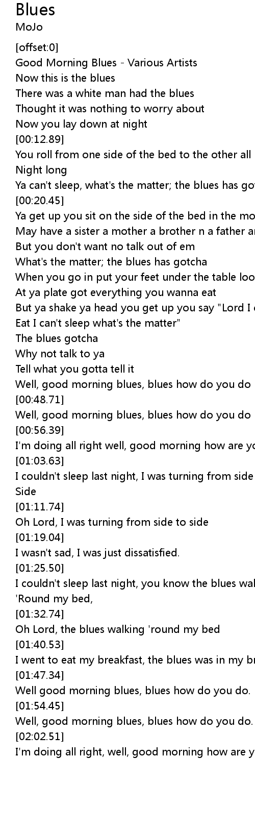 | [00:44.46] | Well, good morning blues, blues how do you do |
