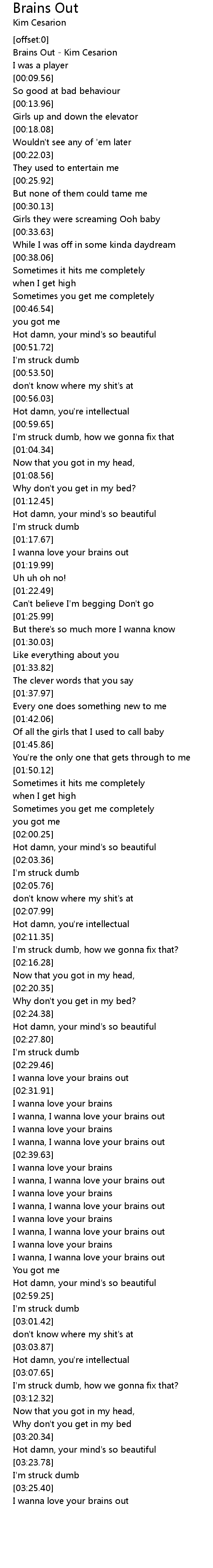 [00:00.72] Brains Out - Kim Cesarion