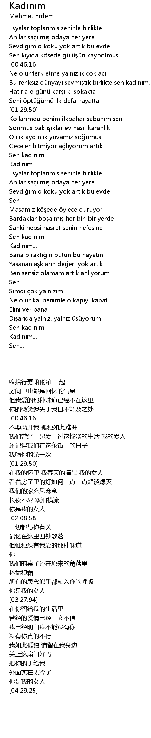 | [00:51.69] | Bu renksiz dünyayı sevmiştik birlikte sen kadınım,kadınım |