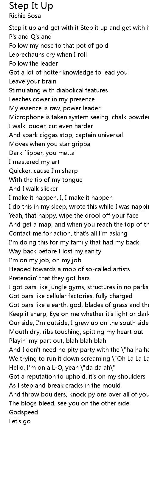 Step it up and get with it Step it up and get with it Yo, I'm on my drows, on my P's and Q's and |