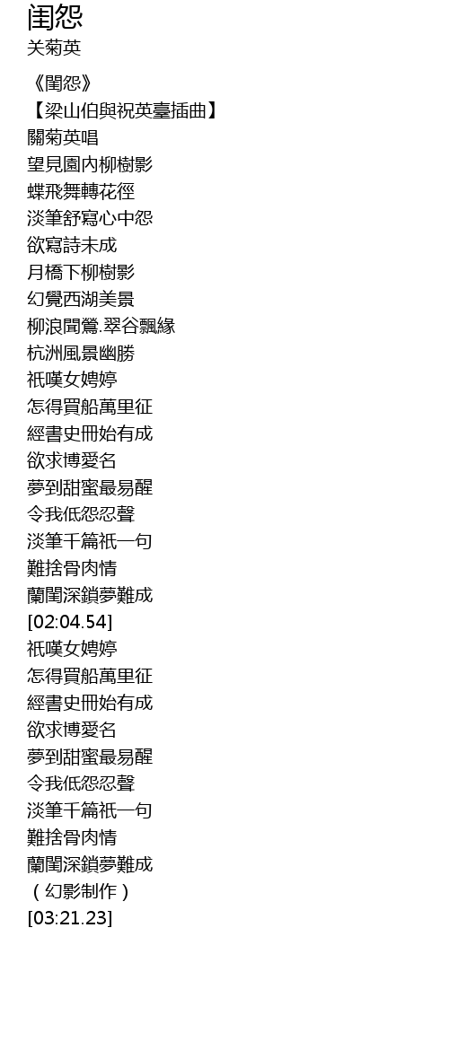 | [00:03.15] | 【梁山伯與祝英臺插曲】 |