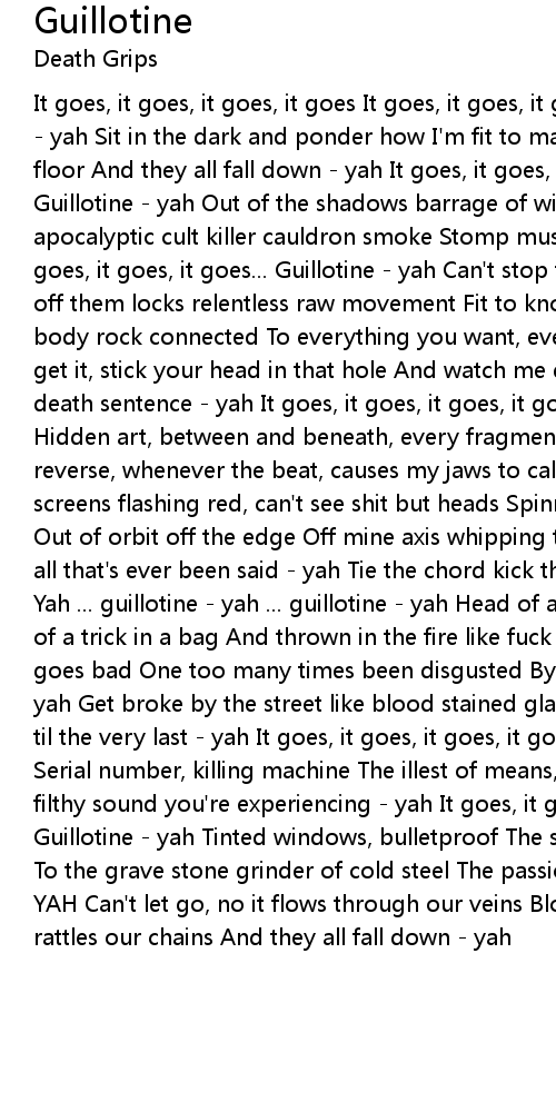 It goes, it goes, it goes, it goes It goes, it goes, it goes, it goes Guillotine - yah Sit in the dark and ponder how I'm fit to make the bottom fall through the floor And they all fall down - yah It goes, it goes, it goes, it goes... Guillotine - yah Out of the shadows barrage of witch tongue Cobra spit over apocalyptic cult killer cauldron smoke Stomp music seriously - yah It goes, it goes, it goes, it goes... Guillotine - yah Can't stop the groove lics jaws clear off them locks relentless raw movement Fit to knock you from here to that g-spot body rock connected To everything you want, ever did want We got it why not come get it, stick your head in that hole And watch me drop this cold guillotine death sentence - yah It goes, it goes, it goes, it goes... Guillotine - yah Hidden art, between and beneath, every fragmented, figure of speech, Tongue in reverse, whenever the beat, causes my jaws to call Out out out out - yah The screens flashing red, can't see shit but heads Spinning exorcist like planets Out of orbit off the edge Off mine axis whipping through doors to far more than all that's ever been said - yah Tie the chord kick the chair and your dead - yah Yah ... guillotine - yah ... guillotine - yah Head of a trick in a bucket Body of a trick in a bag And thrown in the fire like fuck it Gotta burn it before it goes bad One too many times been disgusted By the stench of rot is such a drag - yah Get broke by the street like blood stained glass - yah Choke on these nuts til the very last - yah It goes, it goes, it goes, it goes... Guillotine - yah Serial number, killing machine The illest of means, To an end built on the filthy sound you're experiencing - yah It goes, it goes, it goes, it goes... Guillotine - yah Tinted windows, bulletproof The slip knot fixin rope to noose To the grave stone grinder of cold steel The passion that blinds me so I feel - YAH Can't let go, no it flows through our veins Blows through our tunnels and rattles our chains And they all fall down - yah