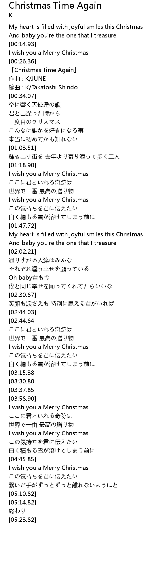 | [03:44.84][03:30.80] | My heart is filled with joyful smiles this Christmas |