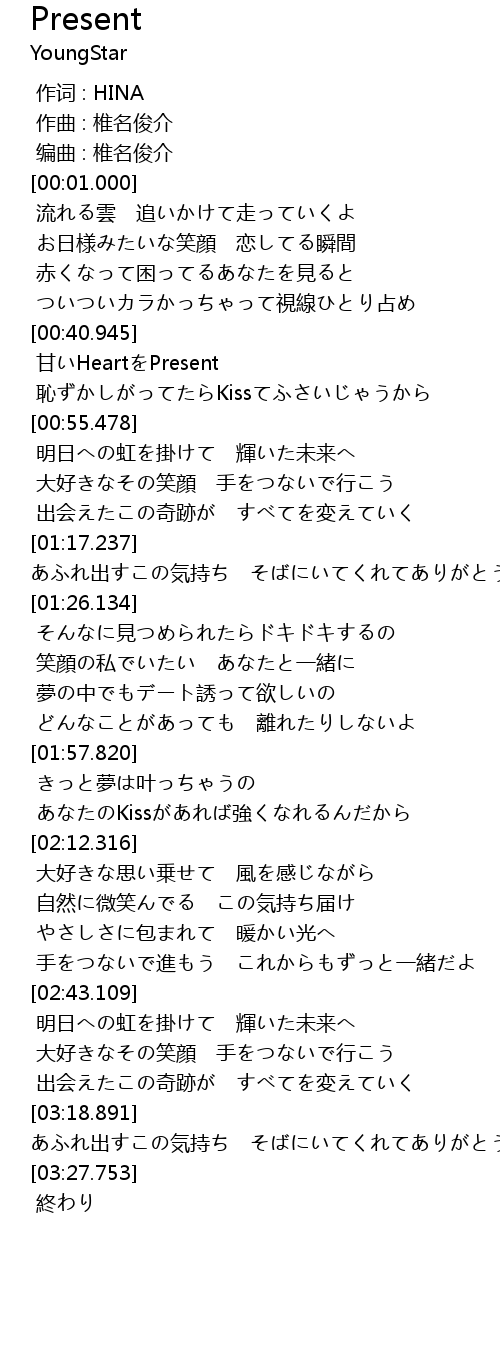 | [02:58.330] | 明日への虹を掛けて 輝いた未来へ |