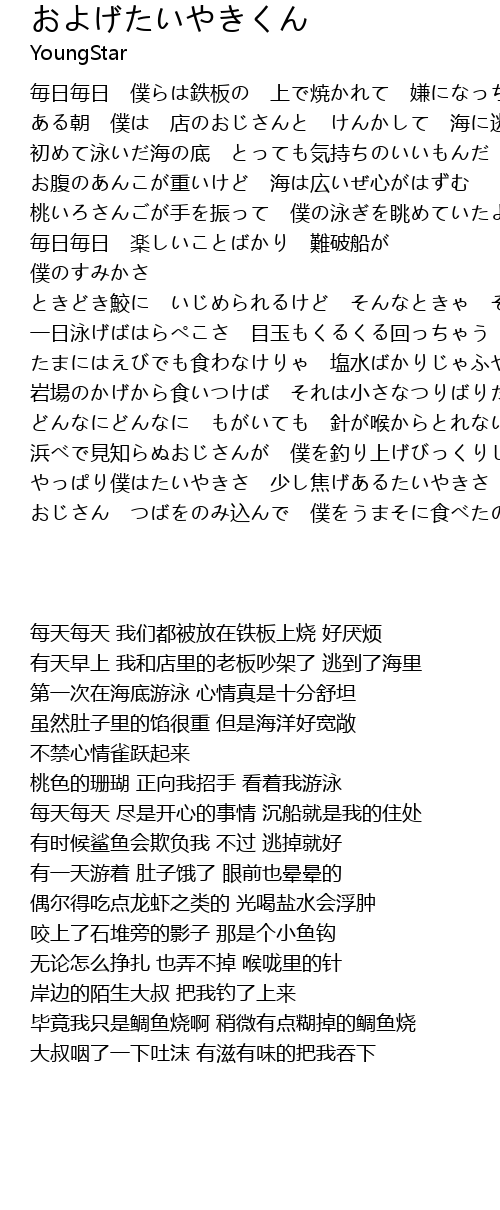 | [02:46.308] | やっぱり僕はたいやきさ 少し焦げあるたいやきさ |
