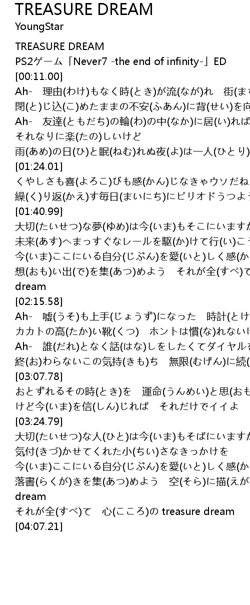 | [04:00.34] | それが全(すべ)て 心(こころ)の treasure dream |