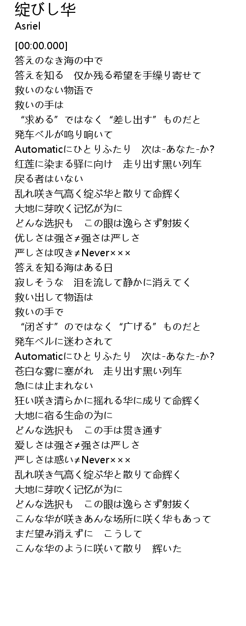 | [03:07.078] | 狂い咲き清らかに摇れる华に成りて命辉く |