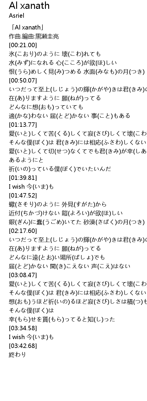 | [03:09.08] | 愛(いと)しくて苦(くる)しくて寂(さび)しくて壊(こわ)れてく |