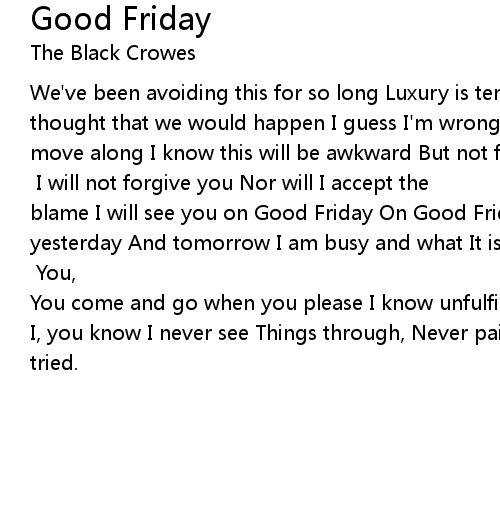 We've been avoiding this for so long Luxury is temporary then it's gone I thought that we would happen I guess I'm wrong wel say hi on the street then move along I know this will be awkward But not for long Cause soon you'll have a new boy To sing you songs [Chorus] I will not forgive you Nor will I accept the blame I will see you on Good Friday On Good Friday I'm sorry I couldn't do this yesterday And tomorrow I am busy and what It is I can't say And Saturday's no good I got a show So it's got to be Good Friday Then it's so long [Bridge] You, You come and go when you please I know unfulfilled heads I know you do too But I, you know I never see Things through, Never paid attention to you But honey I tried.