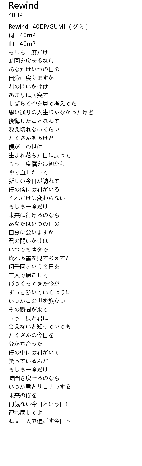 | [00:00.00] | Rewind -40㍍P/GUMI (グミ) |