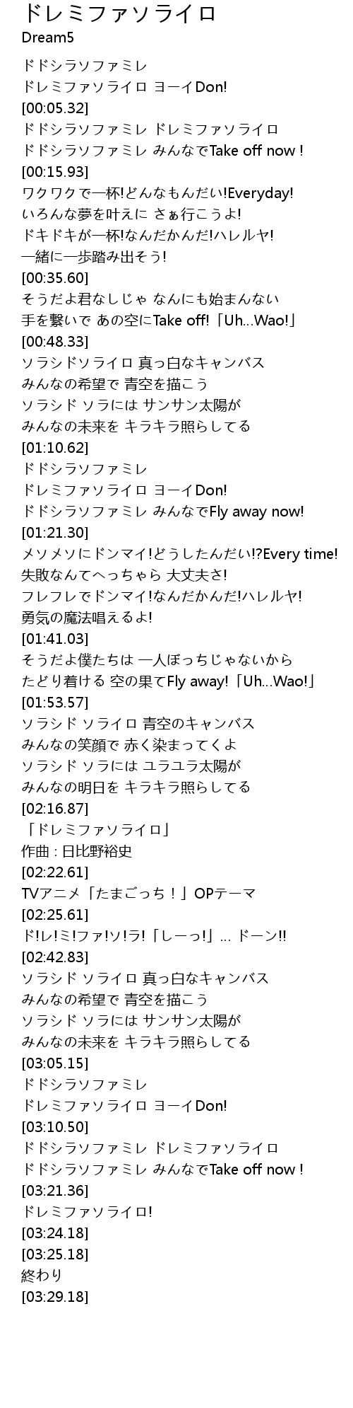 | [00:11.50] | ドドシラソファミレ みんなでTake off now ! |