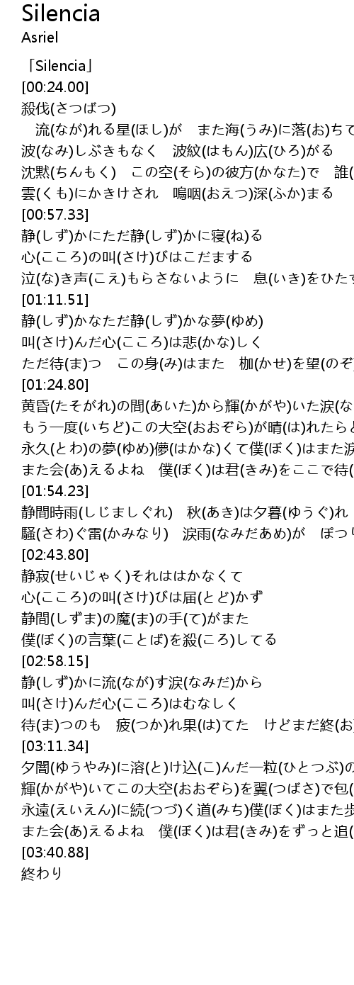 | [00:57.62] | 静(しず)かにただ静(しず)かに寝(ね)る |
