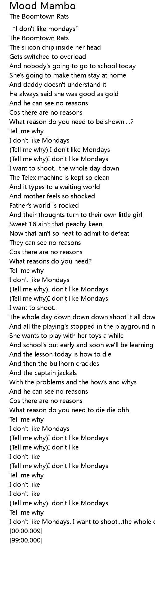 | [00:57.39] | Tell me why I don' t like Mondays |