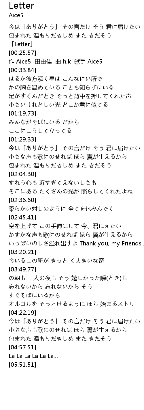 | [00:28.00] | 作 Aice5 田由佳 曲 h.k 歌手 Aice5 |
