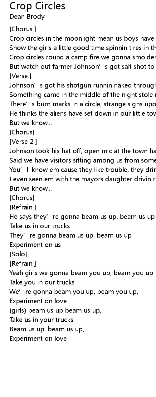 | Crop circles round a camp fire we gonna smolder a little grass | |
