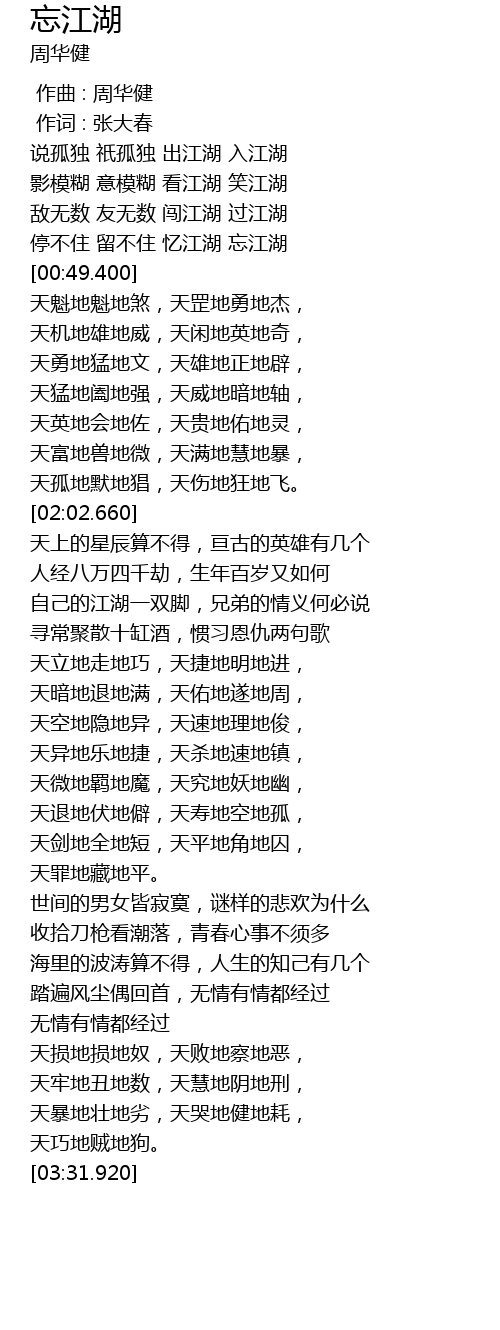 | [00:31.640] | 敌无数 友无数 闯江湖 过江湖 |