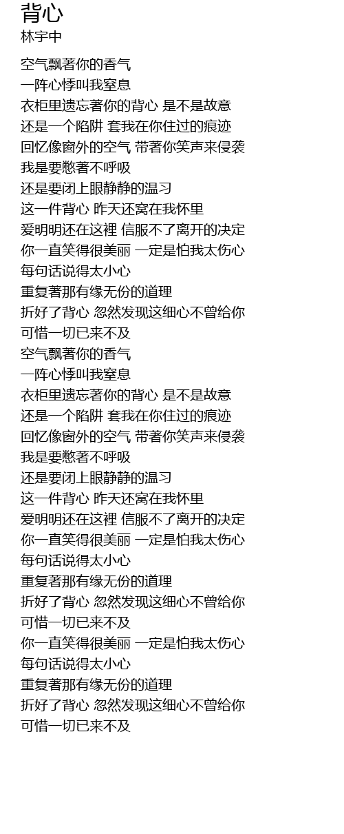 | [00:42.380] | 衣柜里遗忘著你的背心 是不是故意 |