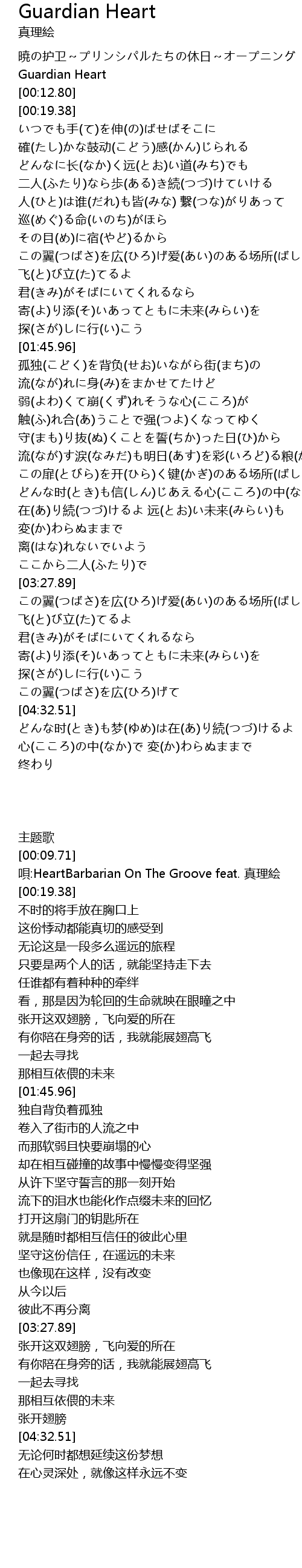 | [00:12.80] | 唄:HeartBarbarian On The Groove feat. 真理絵 |