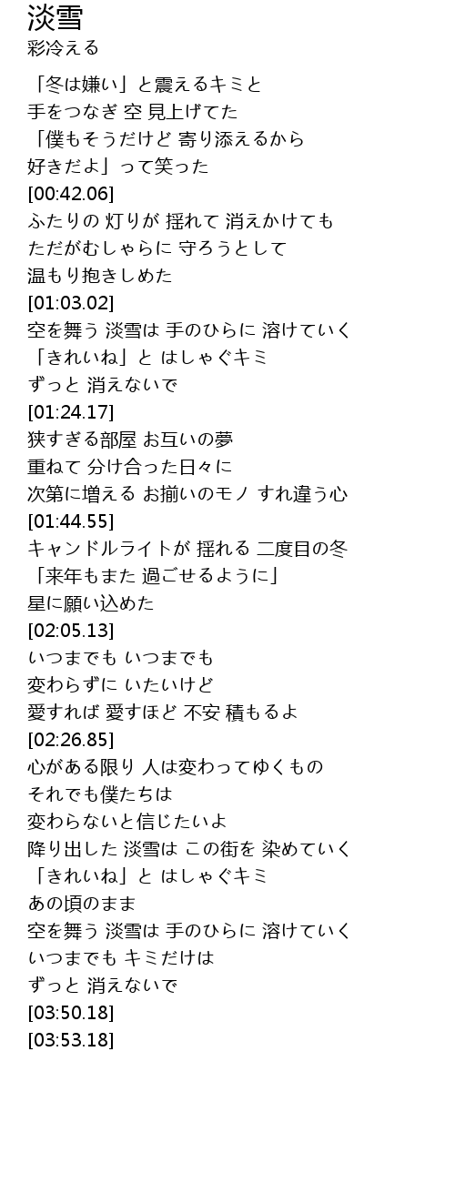 | [03:29.54] | 空を舞う 淡雪は 手のひらに 溶けていく |