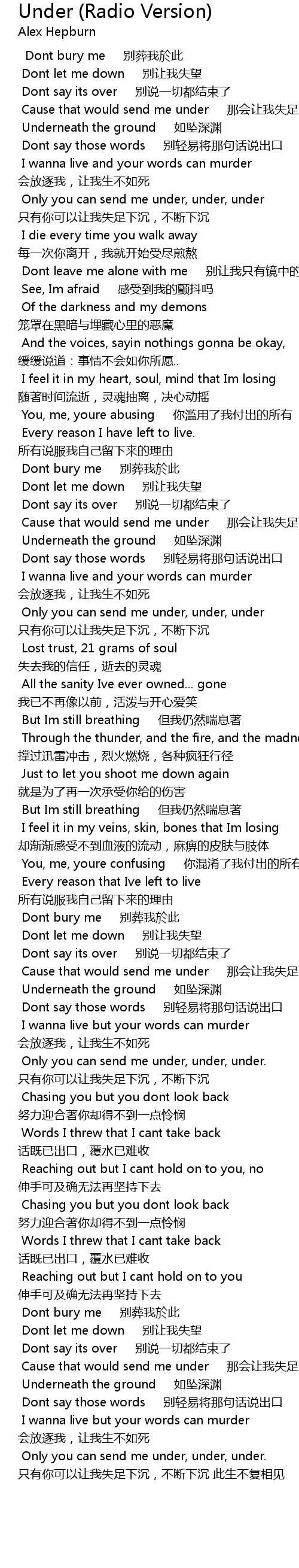 | [03:23.100] | Only you can send me under, under, under. 只有你可以让我失足下沉,不断下沉 此生不复相见 |