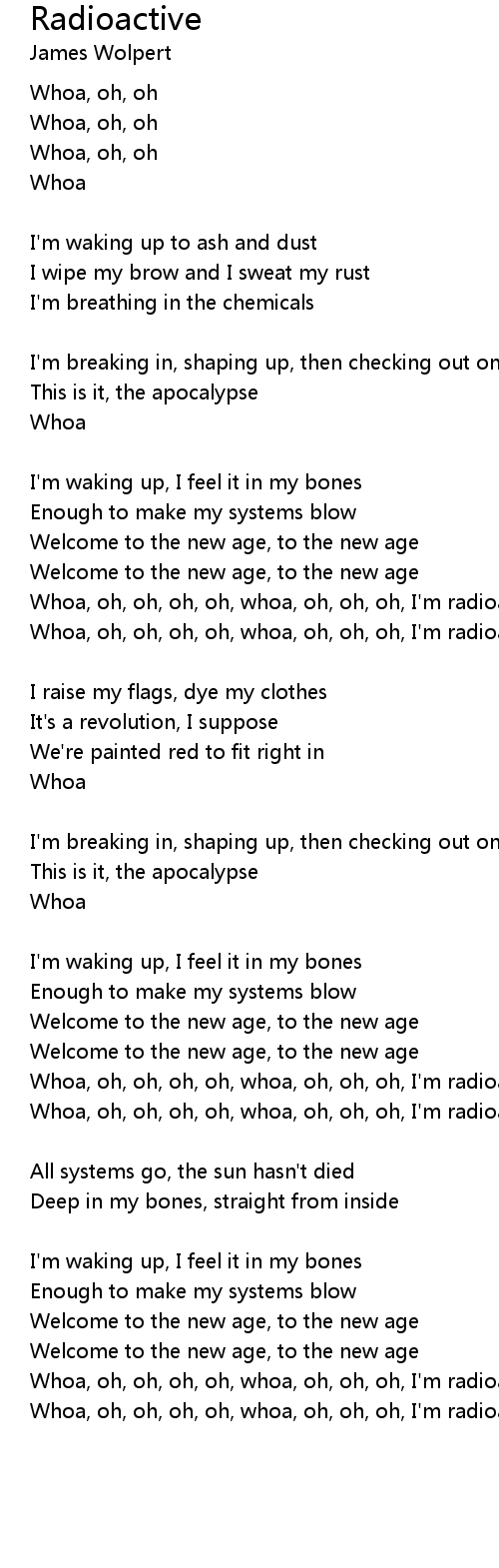 Whoa, oh, oh, oh, oh, whoa, oh, oh, oh, I'm radioactive, radioactive |
