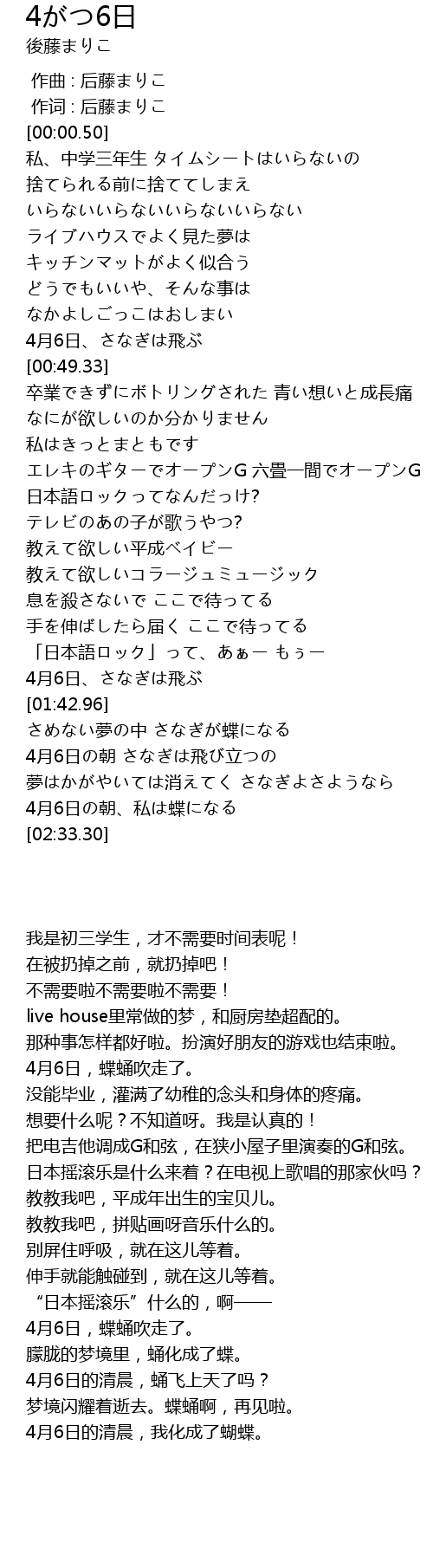 | [02:24.66] | 4月6日の朝、私は蝶になる |