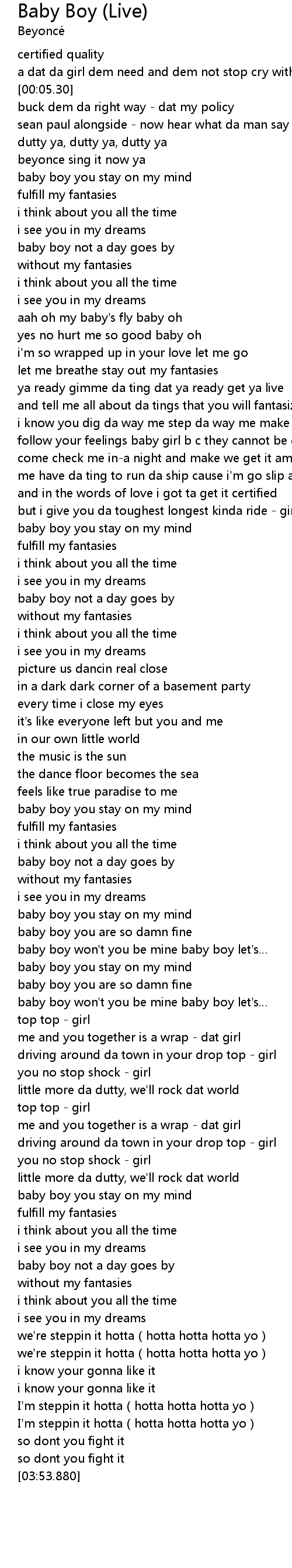 | [00:09.700] | sean paul alongside now hear what da man say beyonce |