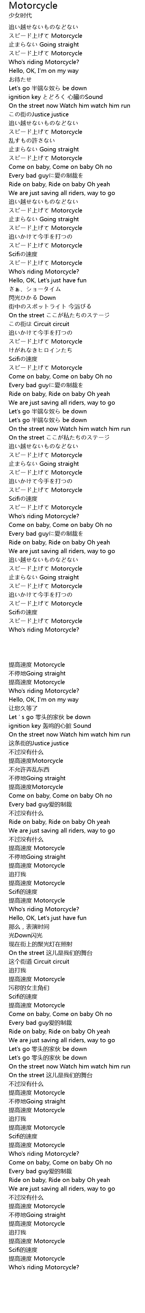 | [00:06.760] | スピード上げて Motorcycle |