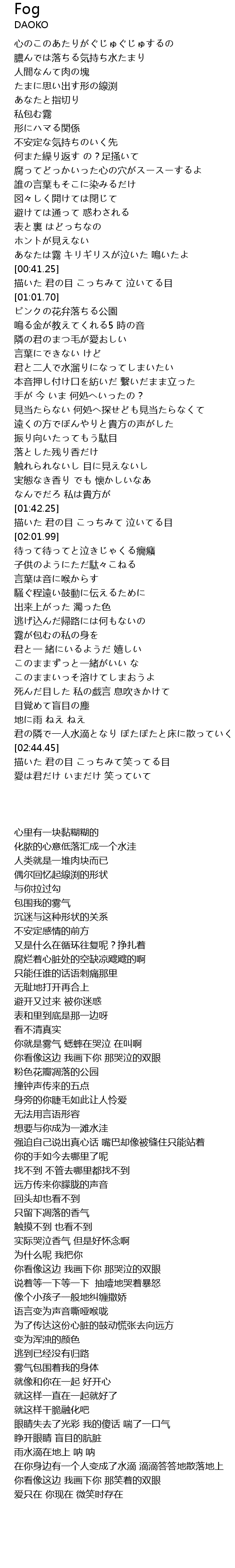 | [00:37.56] | あなたは霧 キリギリスが泣いた 鳴いたよ |