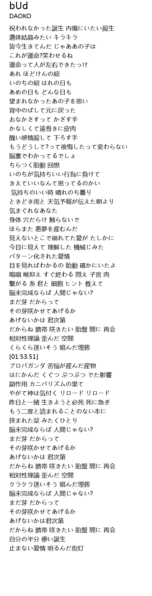 | [01:43.28] | だからね 臍帯 咲きたい 胎盤 間に 再会 |