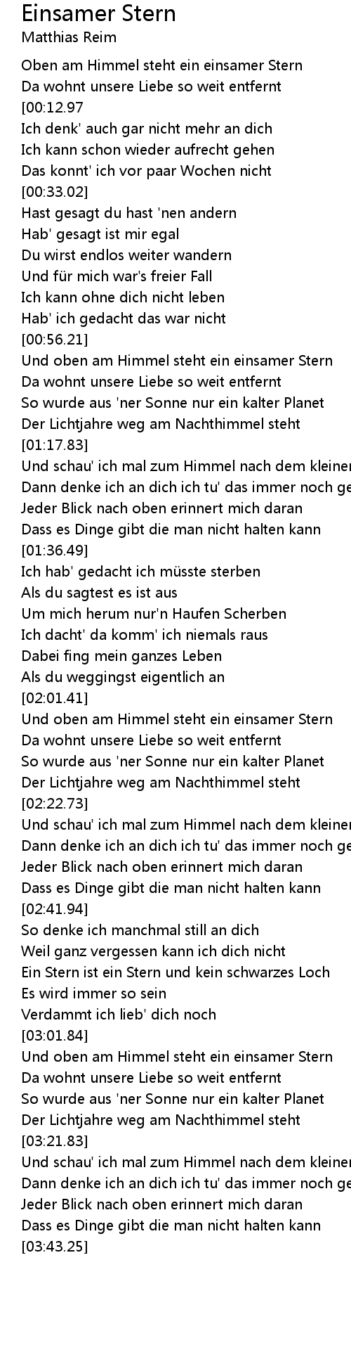 | [02:02.39] | Und oben am Himmel steht ein einsamer Stern |