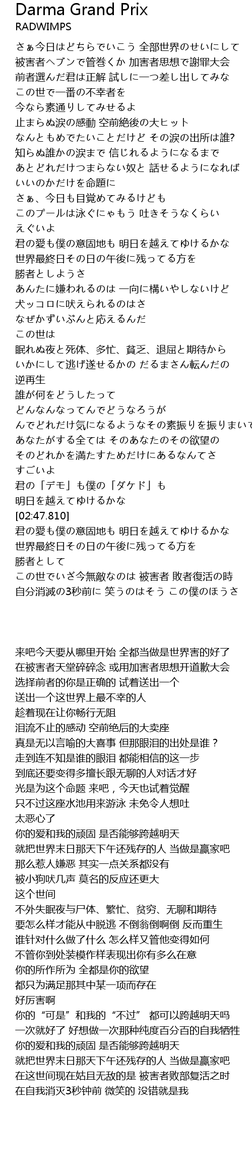 | [03:48.930] | この世でいざ今無敵なのは 被害者 敗者復活の時 |
