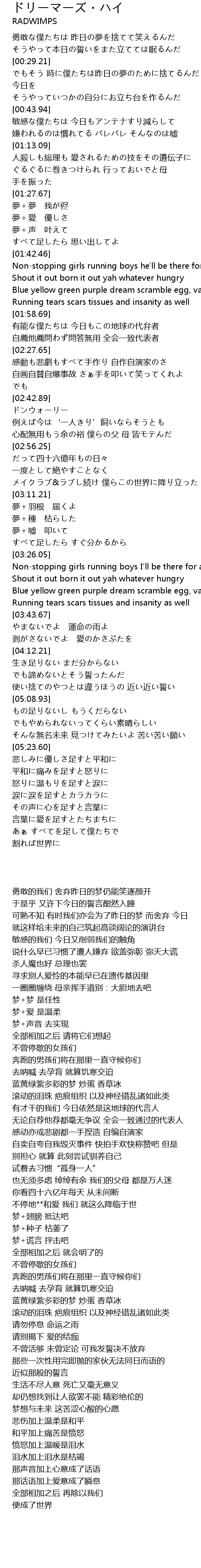 | [00:16.03] | 勇敢な僕たちは 昨日の夢を捨てて笑えるんだ |