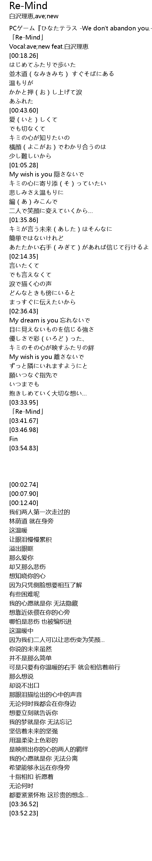 | [00:02.74] | PCゲーム『ひなたテラス -We don't abandon you.-』EDテーマ |