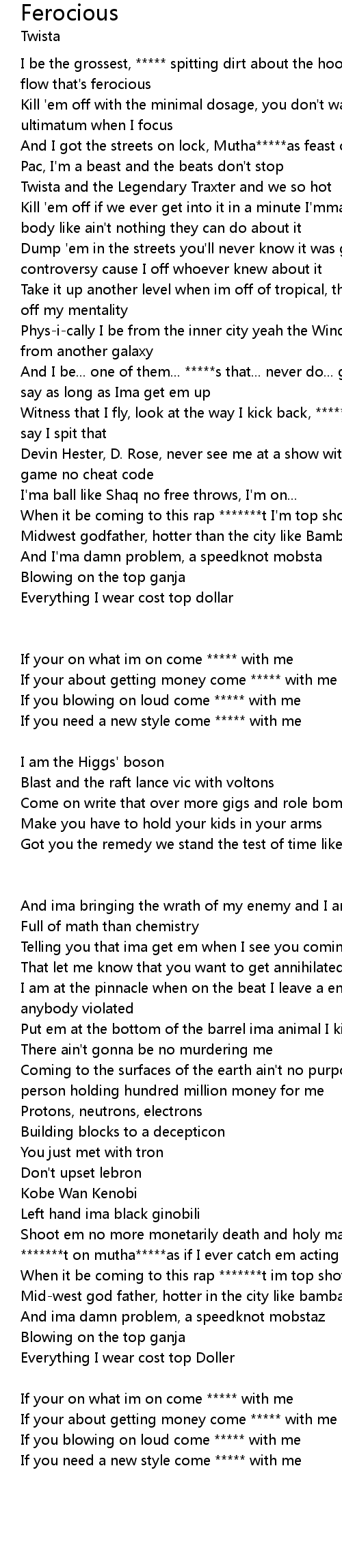 I be the grossest, ***** spitting dirt about the hood, then that go with the flow that's ferocious |