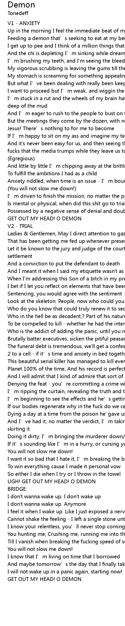 | Feeding a demon that' s seeking to eat at my being | |