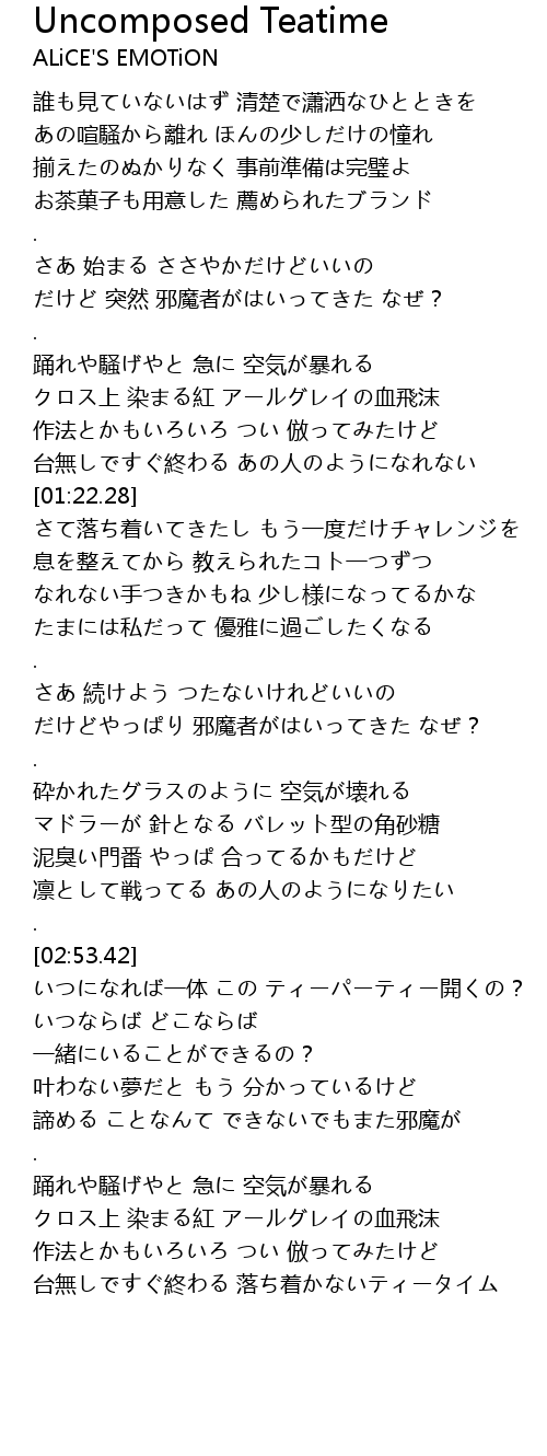 | [03:41.83] | 台無しですぐ終わる 落ち着かないティータイム |