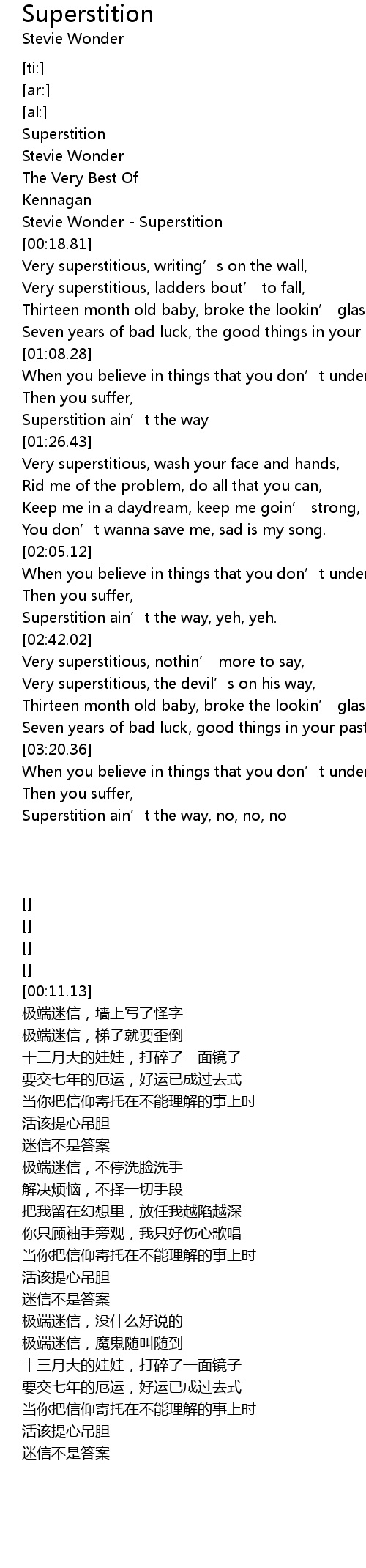 | [02:13.31] | Superstition ain' t the way, yeh, yeh. |