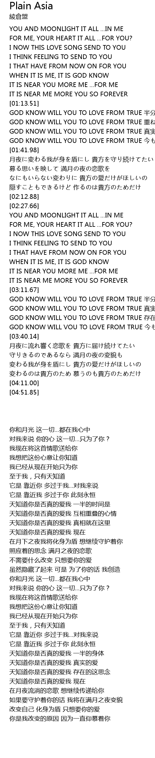 | [03:19.12] | GOD KNOW WILL YOU TO LOVE FROM TRUE zhēn shí ài |