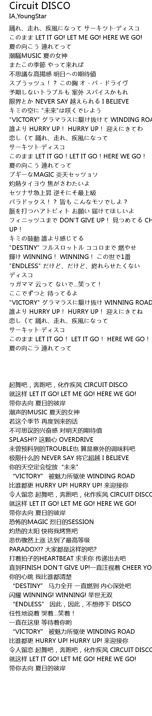 | [00:06.96] | このまま LET IT GO! LET ME GO! HERE WE GO! |