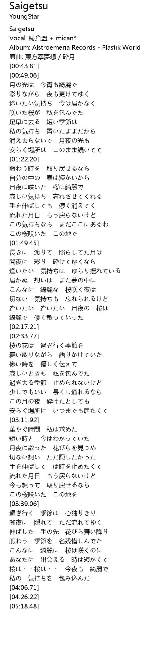 | [00:34.13] | 原曲: 東方萃夢想 / 砕月 |