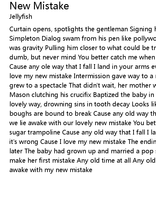 Curtain opens, spotlights the gentleman Signing his love letter best wishes Simpleton Dialog swam from his pen like pollywogs He knew better that perfume was gravity Pulling him closer to what could be tragedy Love is blind, deaf and dumb, but never mind You better catch me when I fall I'm on my roller skates Cause any ole way that I fall I land in your arms even though it's wrong Cause I love my new mistake Intermission gave way to a miracle The birth of an accident grew to a spectacle That didn't wait, her mother was three weeks late So Father Mason clutching his crucifix Baptized the baby in whiskey and licorice What a lovely way, drowning sins in tooth decay Looks like our hero's gonna fall The boughs are bound to break Cause any old way that I fall I'll be in your arms as we lie awake with our lovely new mistake You better catch me when I fall My sugar trampoline Cause any old way that I fall I land in your arms even though it's wrong Cause I love my new mistake The ending turned tragic when many years later The baby had grown up and married a pop singer I think it was her turn to make her first mistake Any old time at all Any old way that I fall I just lie awake with my new mistake |