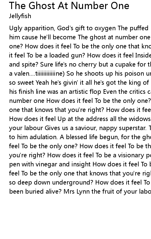 Ugly apparition, God's gift to oxygen The puffed up immortal son How they love him cause he'll become The ghost at number one How does it feel To be the only one? How does it feel To be the only one that knows that you're right? How does it feel To be a loaded gun? How does it feel Inside a chamber packed with piss and spite? Sure life's no cherry but a cupake for the meek (shootupbopbop) (Like a valen....tiiiiiiiiiiiine) So he shoots up his poison until the frosting tastes so sweet Yeah he's givin' it all he's got the king of rebels hit the jackpot But his finish line was an artistic flop Even the critics can't outrun The ghost at number one How does it feel To be the only one? How does it feel To be the only one that knows that you're right? How does it feel To be a chalkline dollar sign How does it feel Up at the address all the widows write? Mrs.Lynn the fruit of your labour Gives us a saviour, nappy superstar. To you we bid congtatulations, to him adulation. A blessed life begun, for the ghost at number one. How does it feel To be the only one? How does it feel To be the only one that knows that you're right? How does it feel To be a visionary poet How does it feel To pack a pen with vinegar and insight How does it feel To be the only one? How does it feel To be the only one that knows that you're right? How does it feel To be a so deep down underground? How does it feel To be the only one who knows you've been buried alive? Mrs Lynn the fruit of your labour Gives us a saviour. |