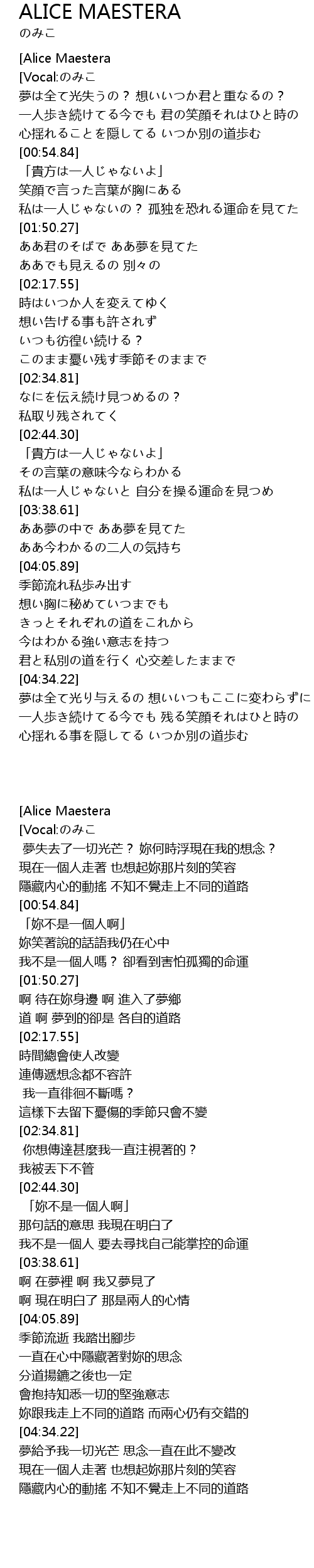 | [03:25.39] | 私は一人じゃないと 自分を操る運命を見つめ |