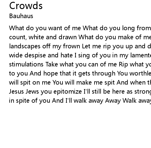 What do you want of me What do you long from me A slim Pixie, thin and forlorn A count, white and drawn What do you make of me What can you take from me Pallid landscapes off my frown Let me rip you up and down For you I came to forsake Lay wide despise and hate I sing of you in my lamented* songs For you and your stimulations Take what you can of me Rip what you can off me And this I'll say to you And hope that it gets through You worthless bitch You fickle shit You will spit on me You will make me spit And when the Judas howl arise And like the Jesus Jews you epitomize I'll still be here as strong as you And I'll walk away in spite of you And I'll walk away Away Walk away (repeat) |