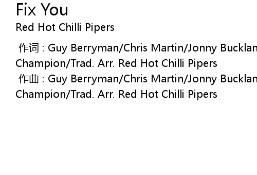 | [00:00.000] | zuo ci : Guy Berryman Chris Martin Jonny Buckland Will Champion Trad. Arr. Red Hot Chilli Pipers |